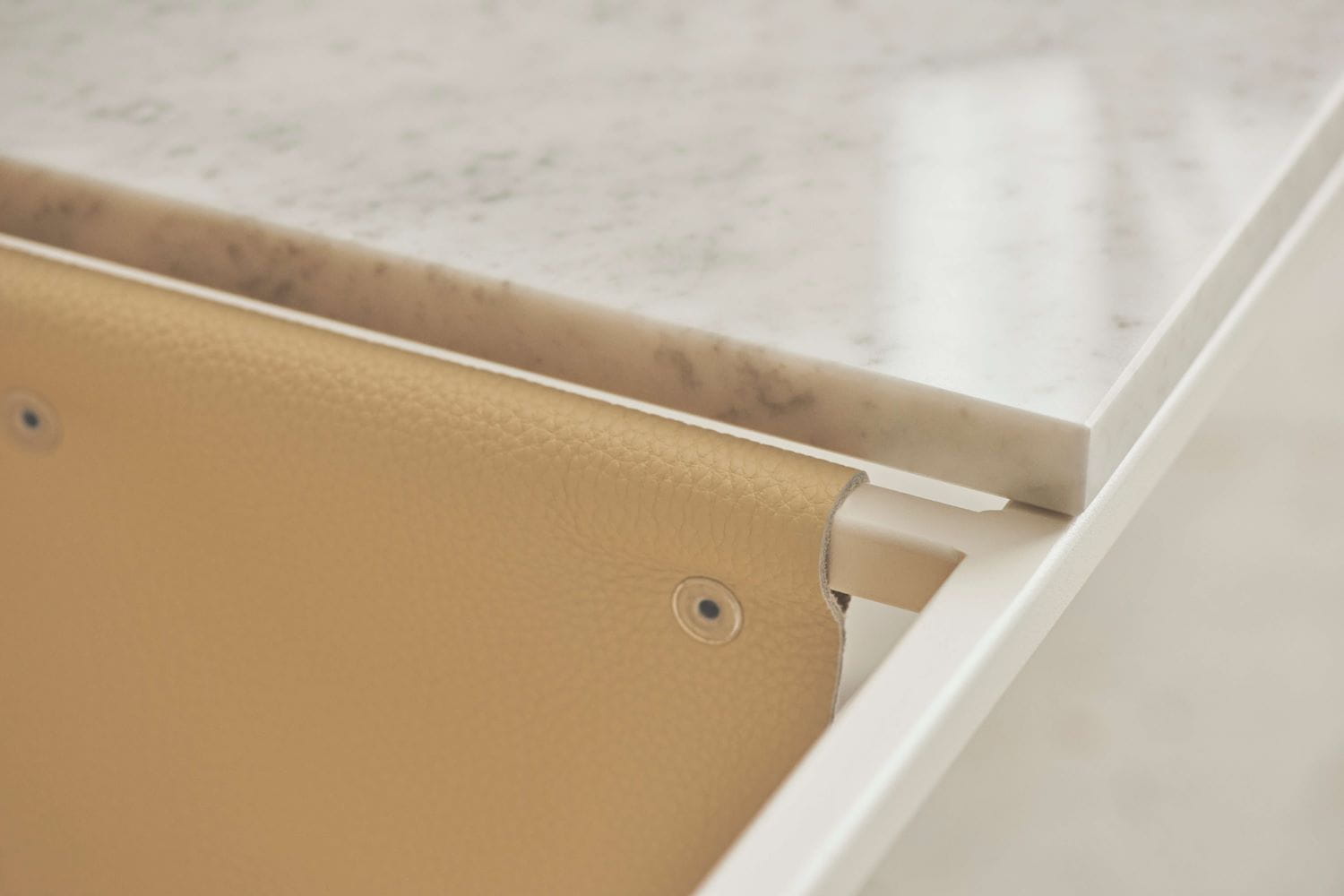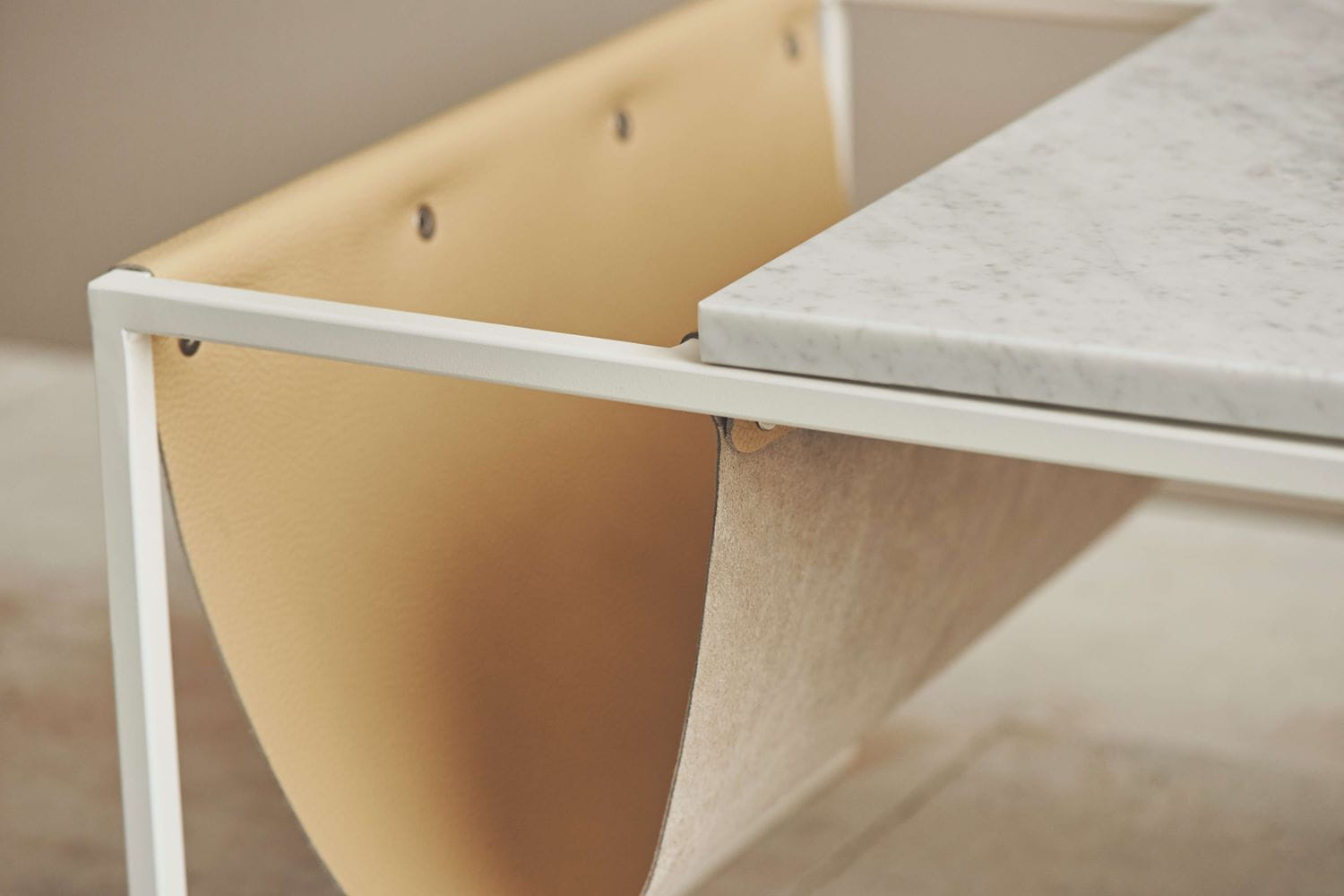Stół w wykończeniu - blat z trawertynu, skóra beżowa, stalowa rama w kolorze kremowym.