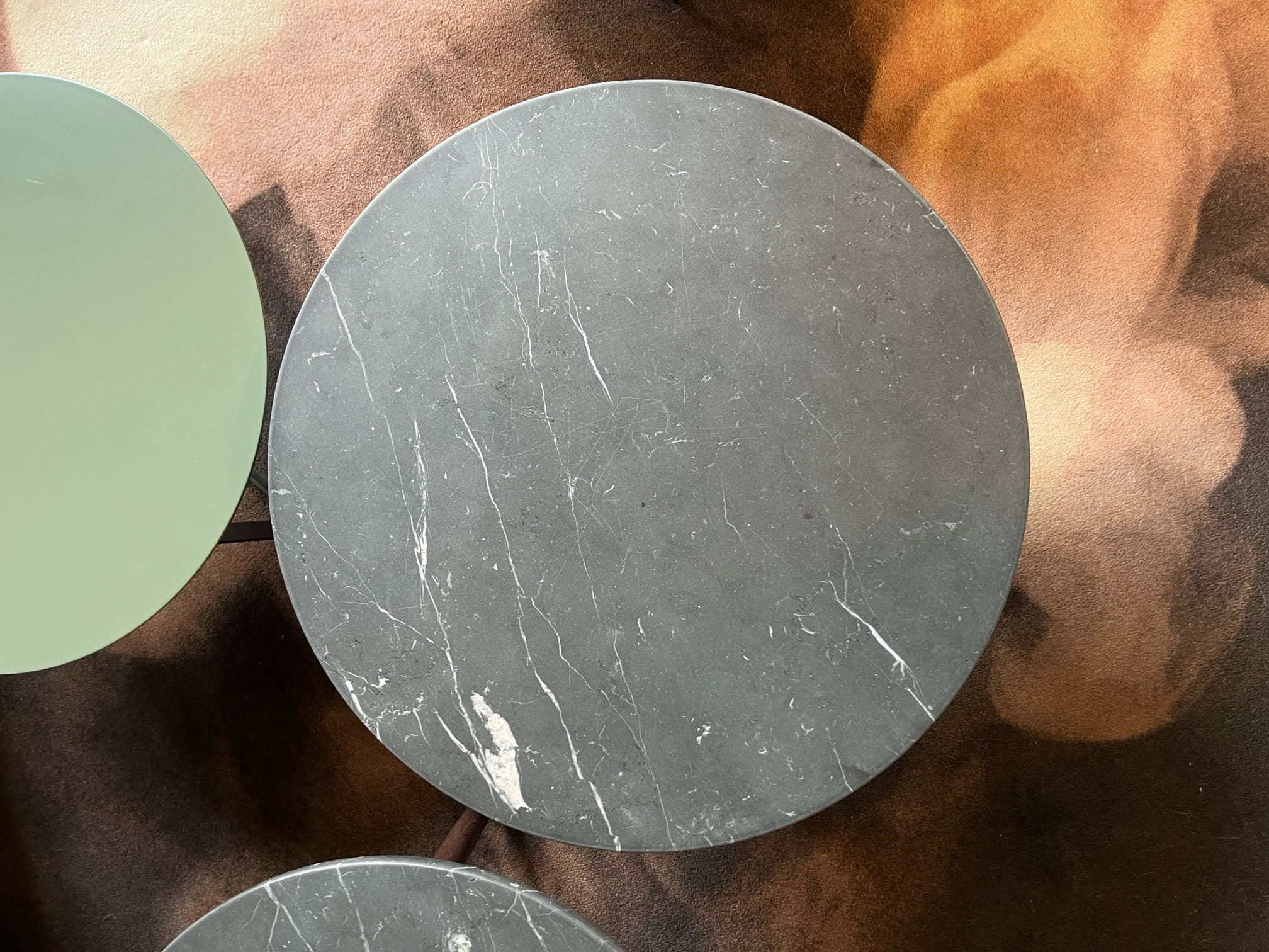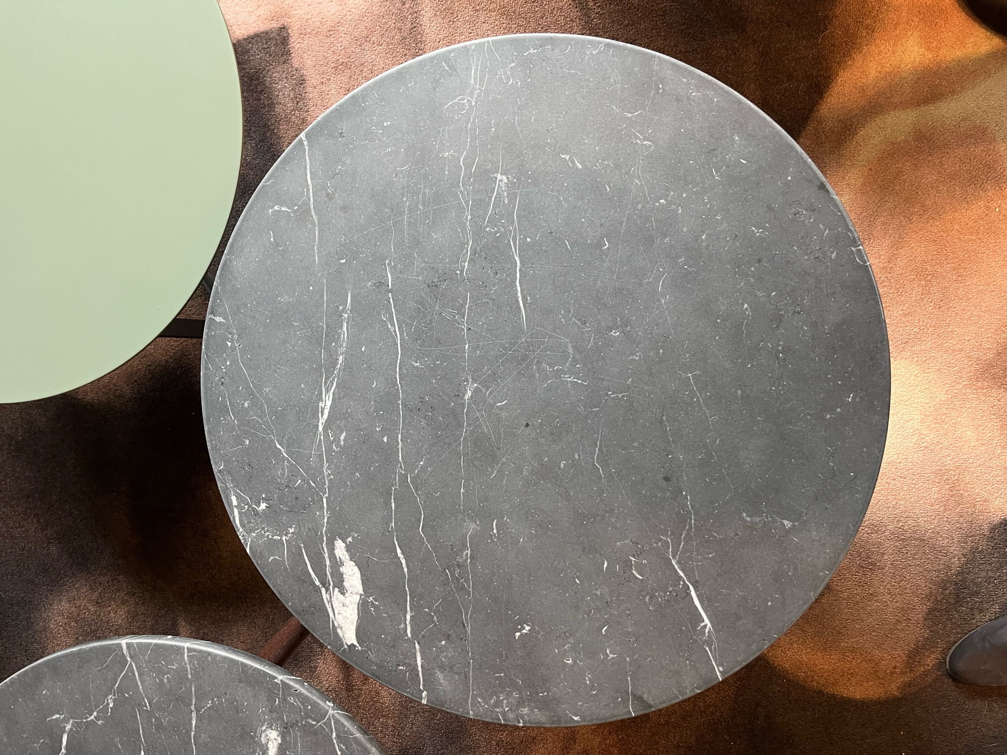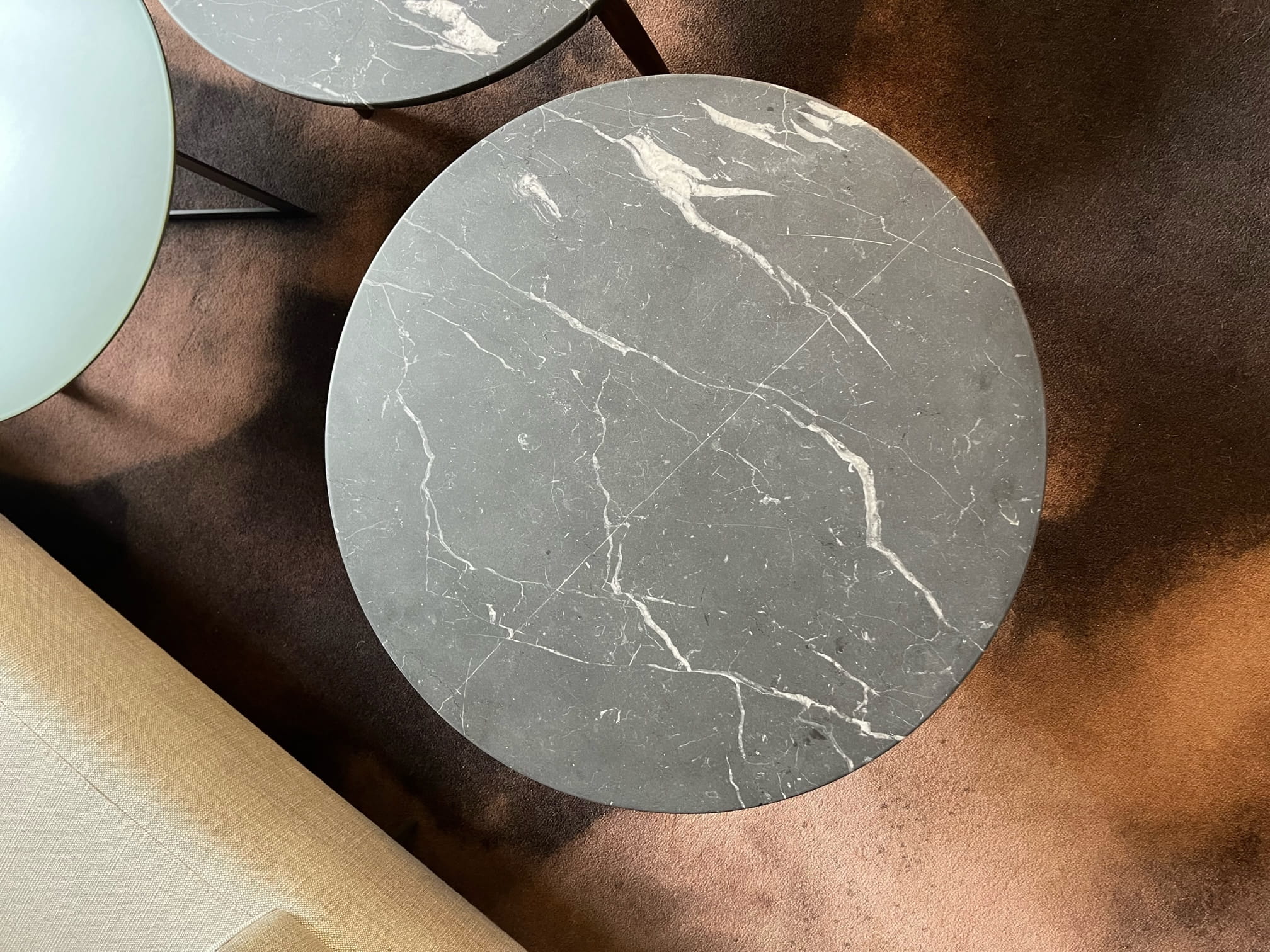 Stoliki są dostępne w 2 sztukach, blaty różnią się między sobą ze względu na naturalne właściwości marmuru.