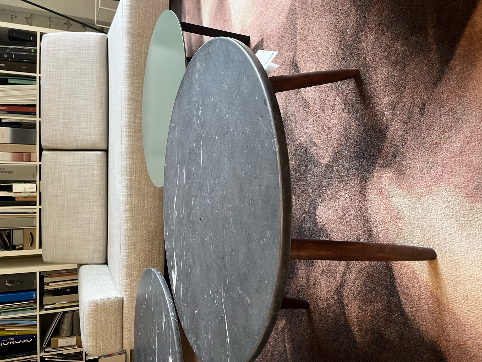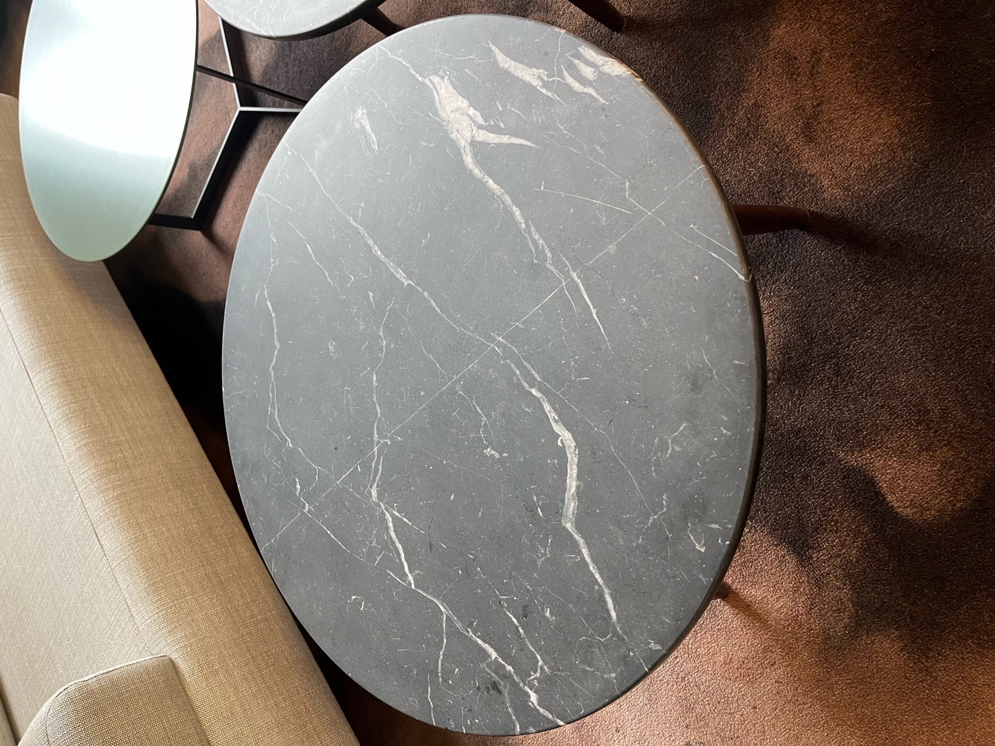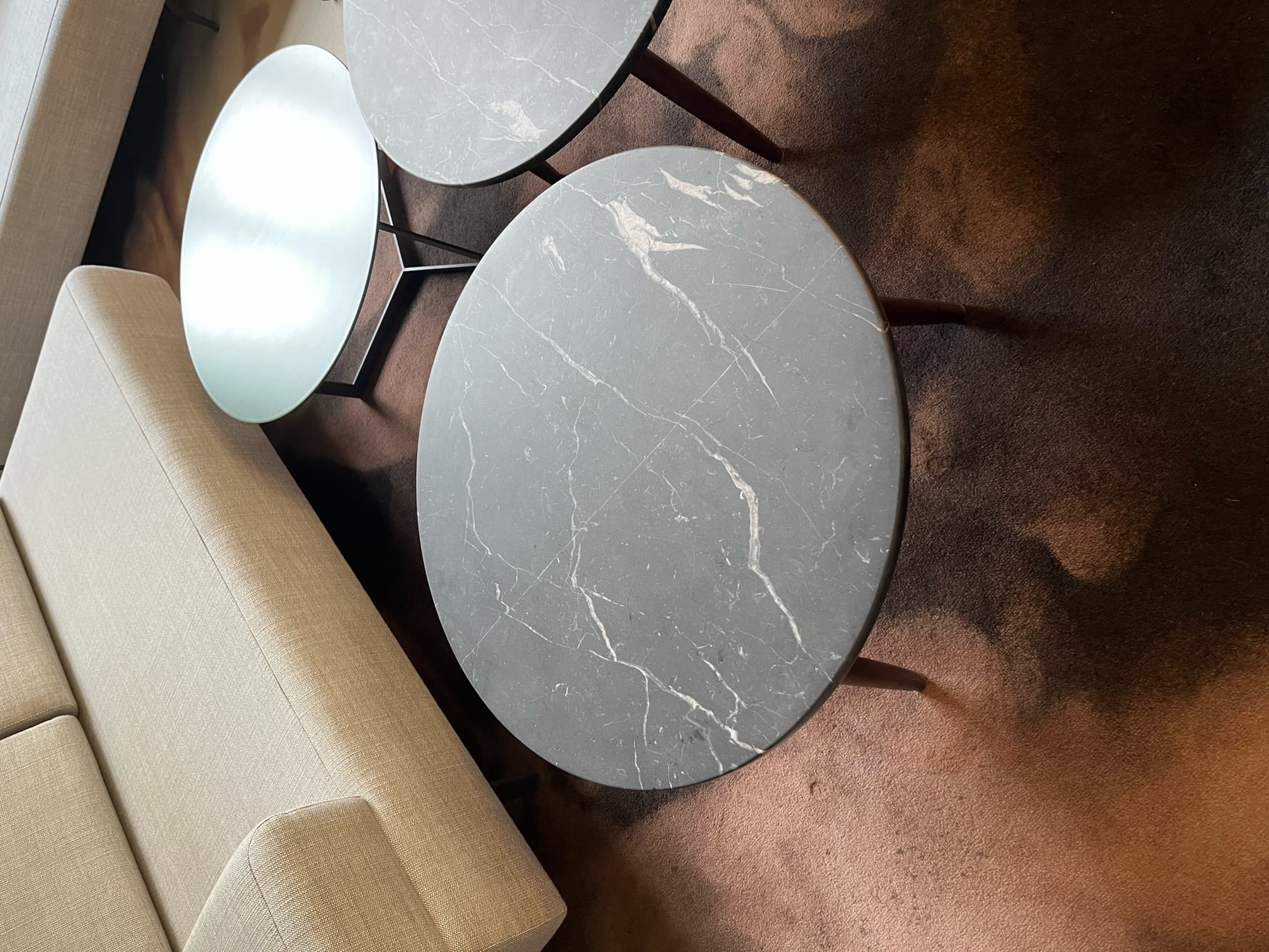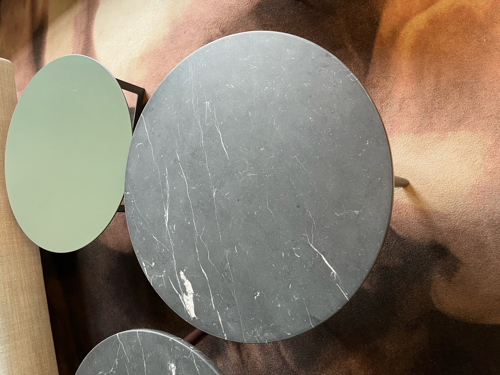 Stoliki są dostępne w 2 sztukach, blaty różnią się między sobą ze względu na naturalne właściwości marmuru.