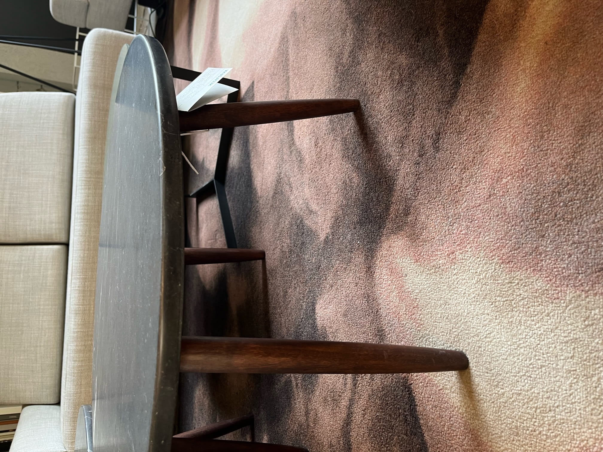 Stolik kawowy z blatem z naturalnego kamienia, z czarnego marmuru z białymi żyłkami. Pokryty matowym lakierem zabezpieczającym powierzchnię kamienia.