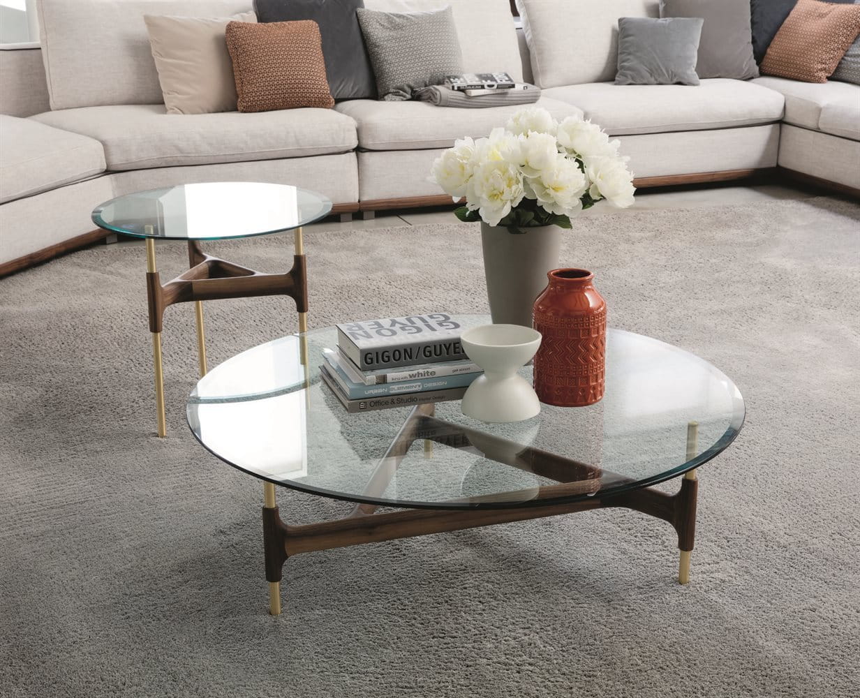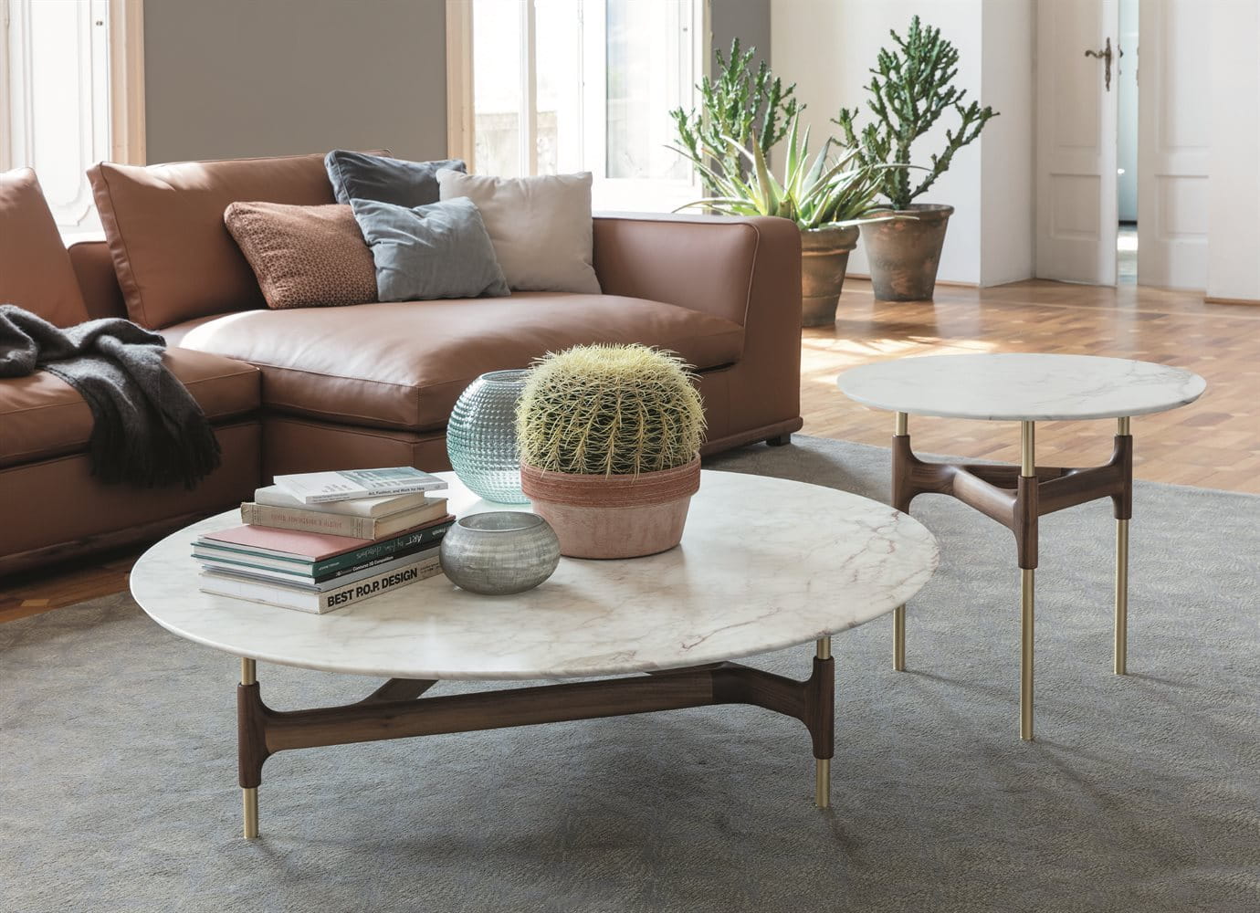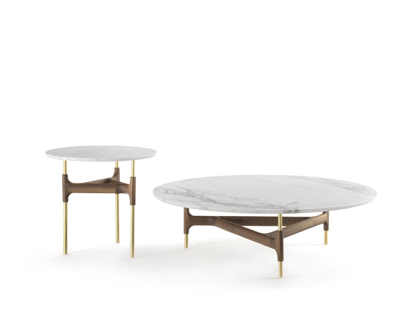 Kolekcja stolików kawowych składająca się z 2 stolików: małego i dużego dostępnych w wersji z blatem z marmuru lub szkła.