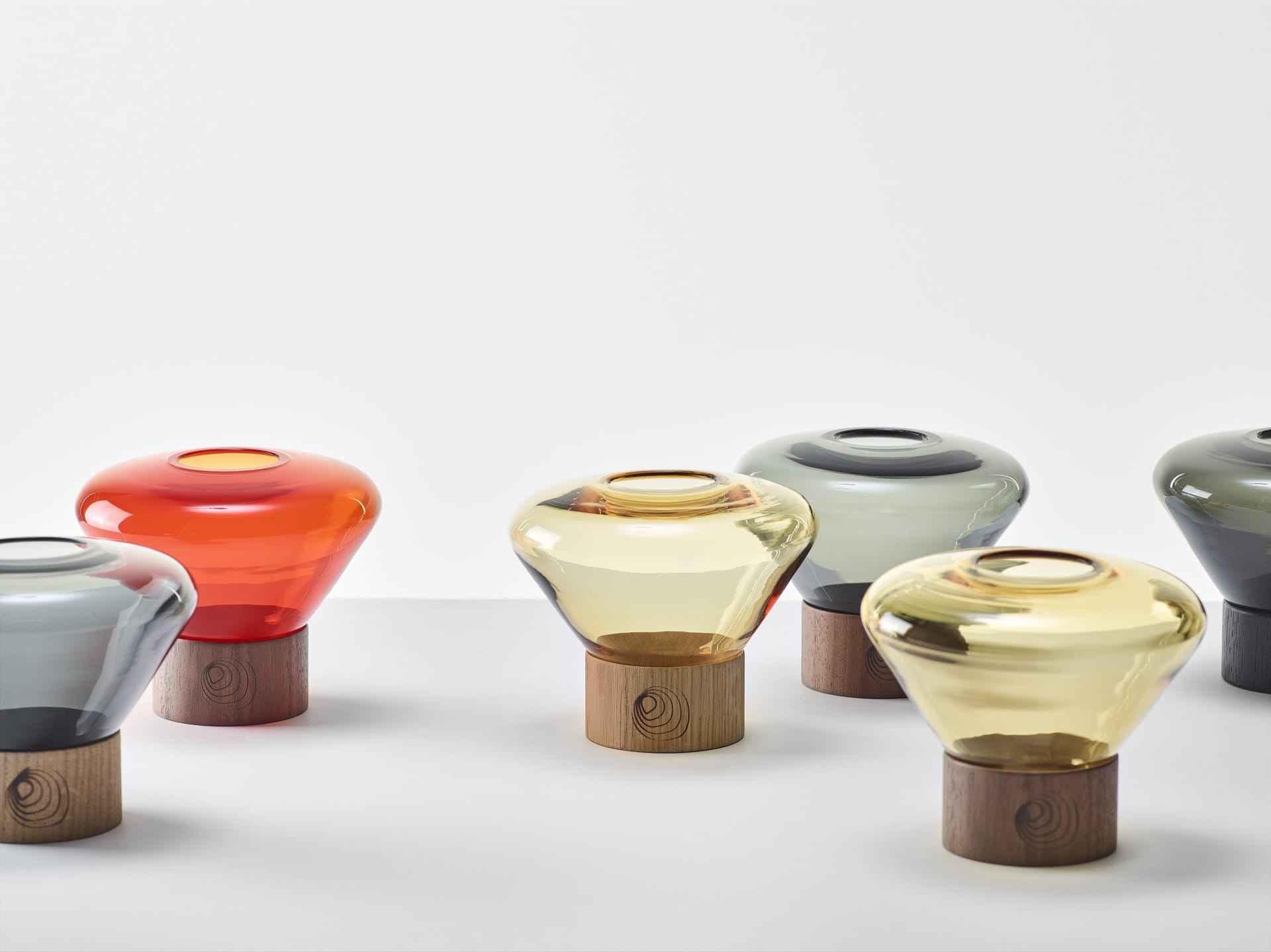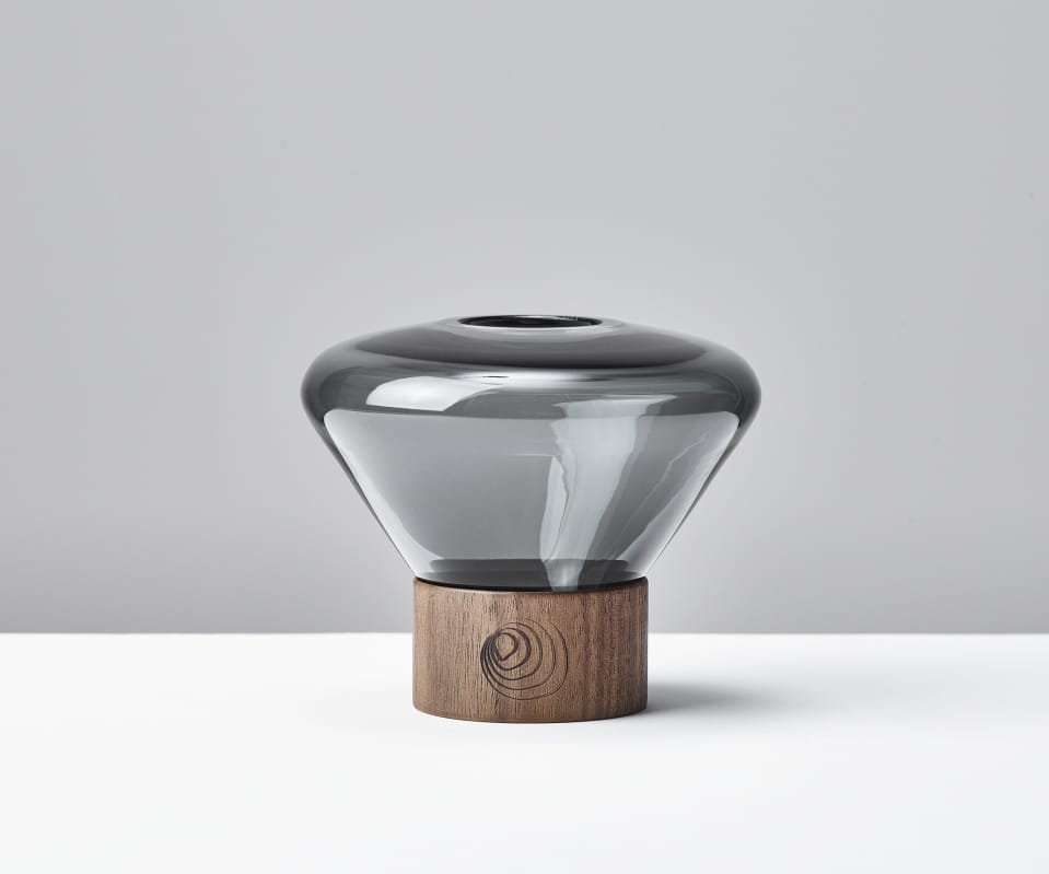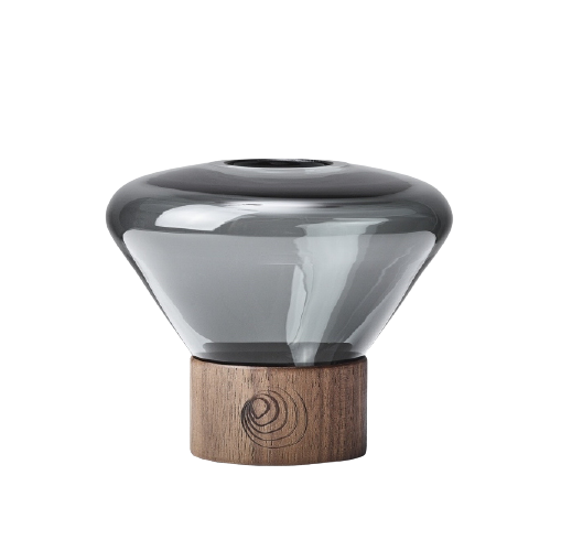 Podstawa z orzecha amerykańskiego, szkło w kolorze szarym.