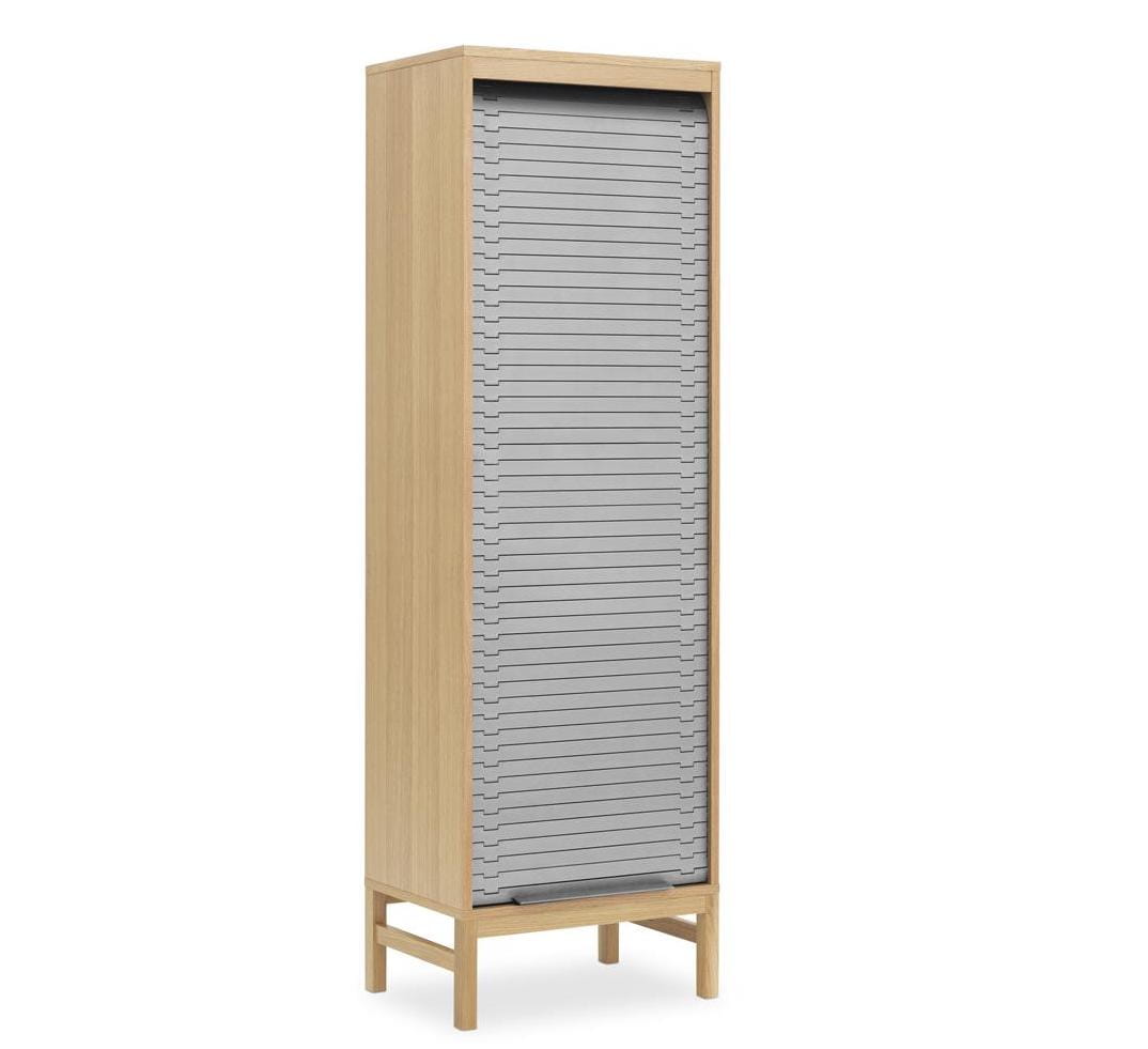 Kolekcja Jalousi, na którą składają się komoda i szafki w dwóch różnych rozmiarach, charakteryzuje się minimalistycznym wyglądem i kontrastowym połączeniem materiałów. Wszystkie projekty są wyposażone w praktyczne rolety w atrakcyjnych odcieniach kolorystycznych. Kolorowe okiennice tworzą kontrast z korpusem szafy w okleinie dębowej z nogami z litego drewna dębowego.