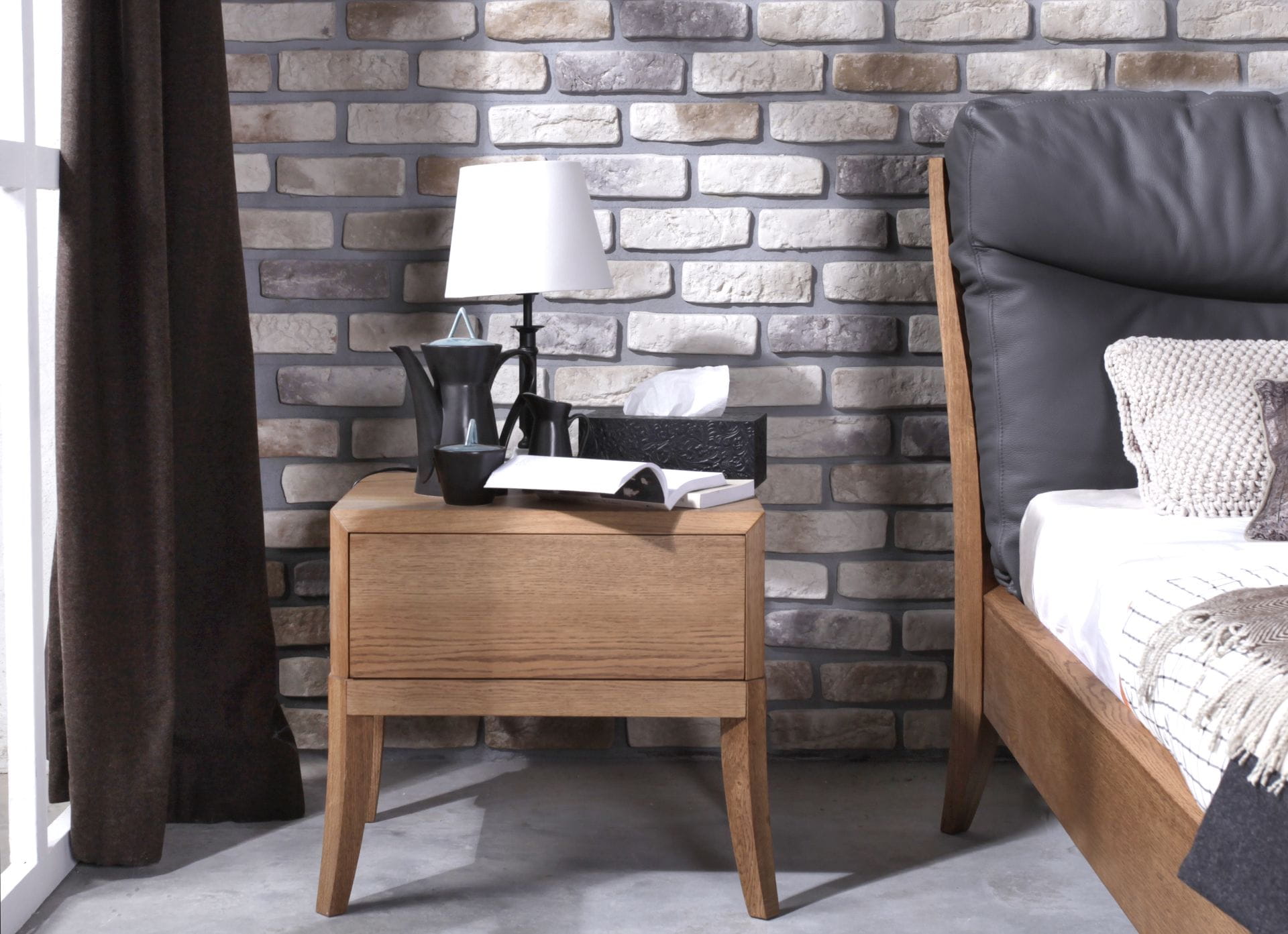 Nogi i ramy z drewna dębowego. Stolarskie połączenia korpusów i ram na ucios. Fronty i korpusy dwustronnie fornirowane. Szuflady otwierane metodą push na prowadnicach Bloom.