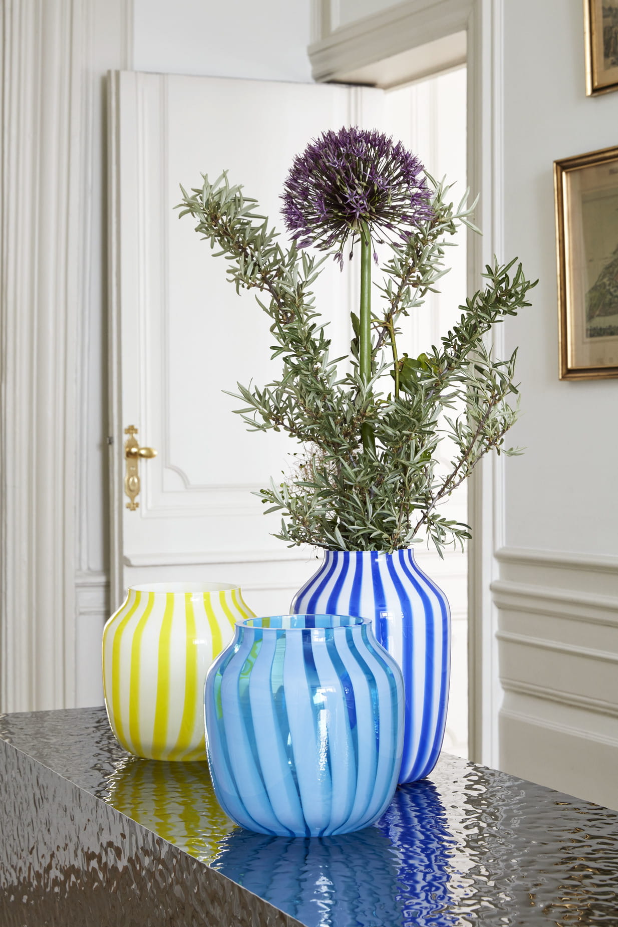 Pionowe nieprzezroczyste i przezroczyste paski tworzą subtelne zróżnicowanie kolorystyczne w kolekcji szklanych wazonów Kristine Five Melvær. Dostępny w dwóch rozmiarach w trzech różnych kombinacjach kolorystycznych.