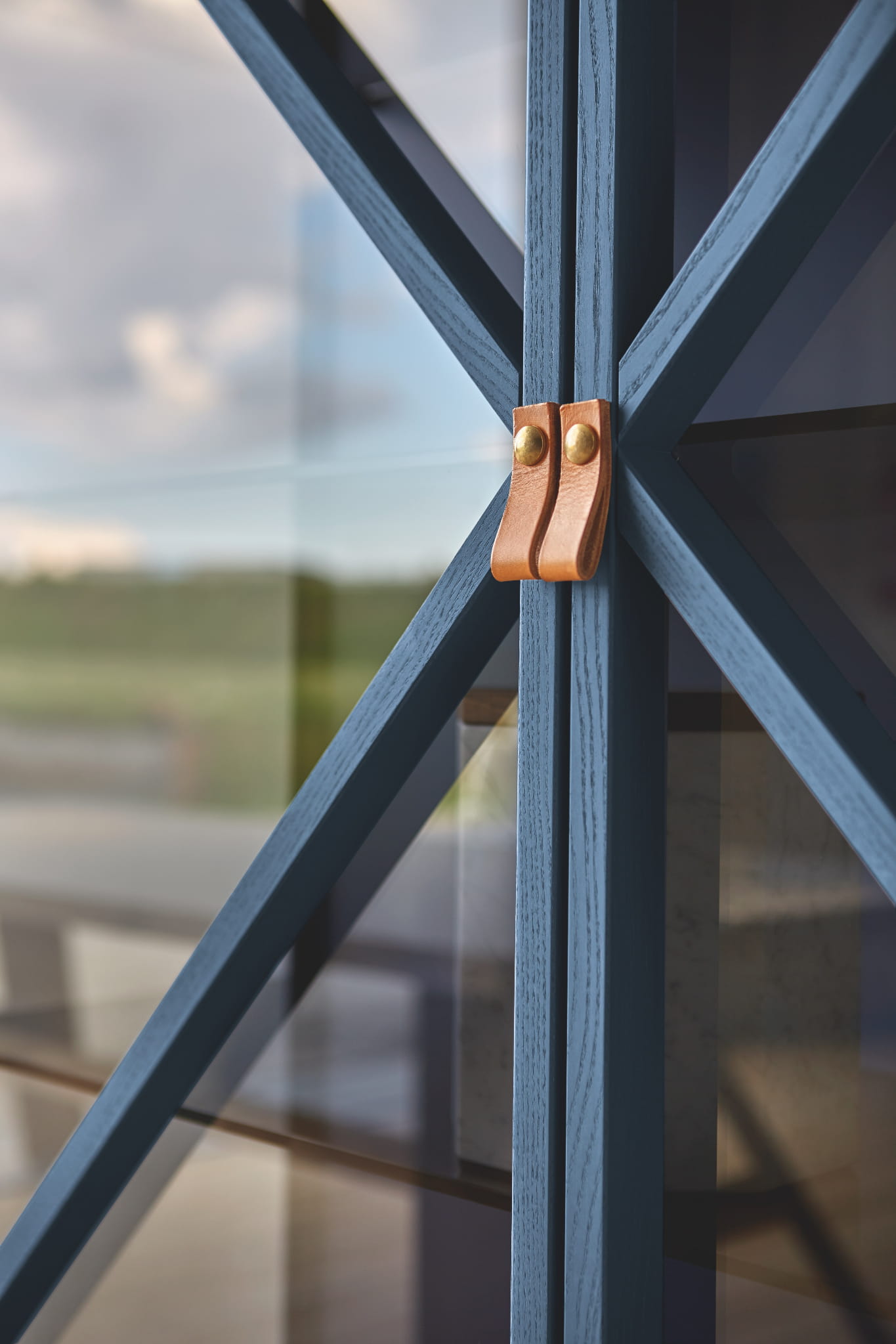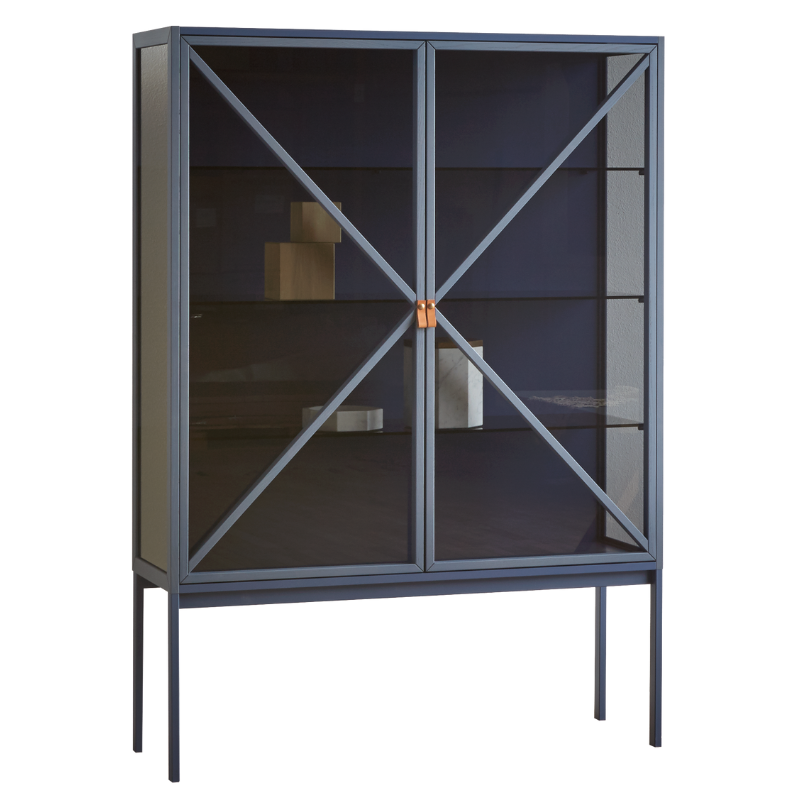 Witryna z drzwiami ze szkła Grey Europe i wewnętrznym oświetleniem ledowym. Rama z jesionu, orzecha barwionego na jesion lub czarnego jesionu. Podstawa lakierowana na czarno. Z uchwytami skórzanymi.