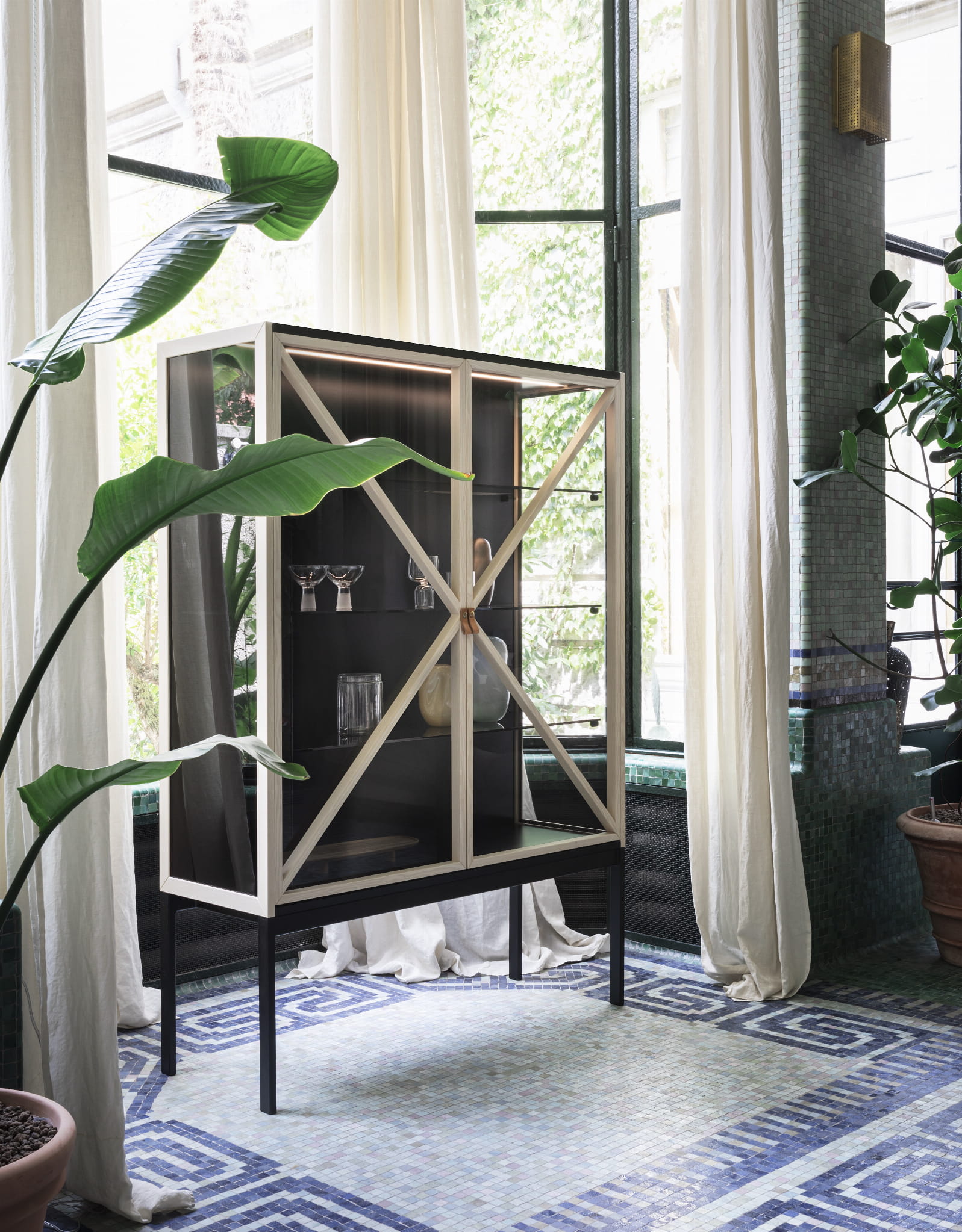 Dostępne w dwóch różnych wysokościach i rozmiarach, opowiadają historie domowego życia, współgrając z przezroczystością przydymionego szkła i wewnętrznym oświetleniem. Jest teatralna, sceniczna, przenosi objętość antycznych mebli do współczesności.