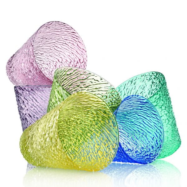 Zestaw 6 różnokolorowych szklanek z dmuchanego szkła w jednolitym kolorze.
