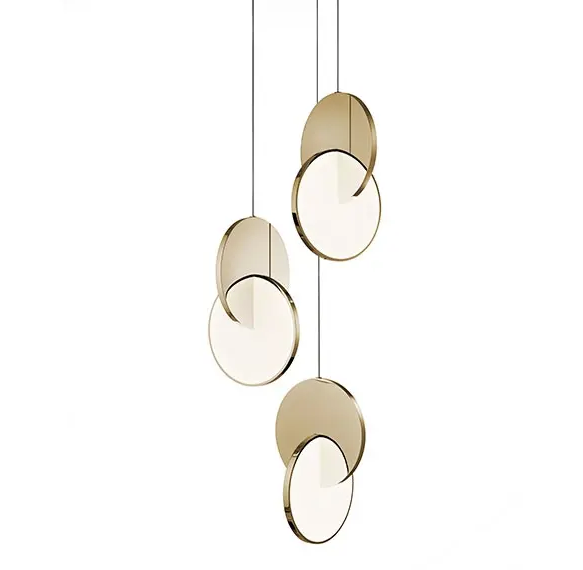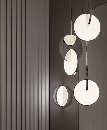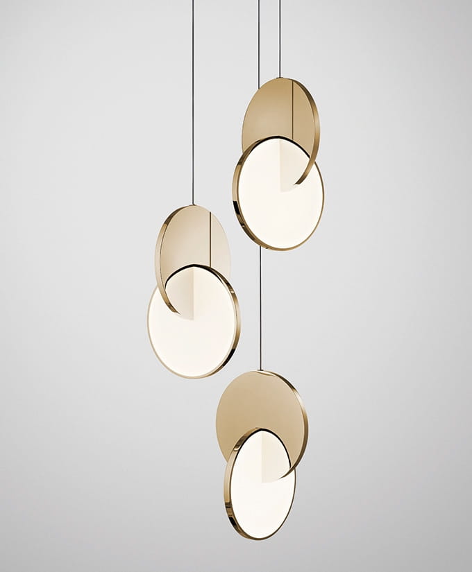 Lampa Eclipse jest niebiańska zarówno w nazwie, jak i inspiracji. Polerowane na lustro i złoto akrylowe dyski oddziałują na siebie, rozcinają i zasłaniają, co jednocześnie przyćmiewa i ujawnia widzowi swoje rozświetlenie.