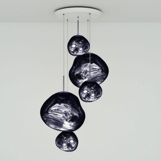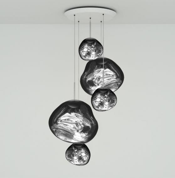 Niezwykły żyrandol zawierający dwie lampy Melt i trzy Melt Mini w nowoczesnym wykończeniu w czterech kolorach. Wyposażona w zintegrowany moduł LED, ta lampa sufitowa tworzy hipnotyzujący efekt topiącego się, dmuchanego na gorąco szkła, gdy jest włączona i efekt lustrzanego wykończenia, gdy jest wyłączona. Wykonana w Niemczech przy użyciu zaawansowanej technologii produkcji, aby osiągnąć perfekcyjny efekt stopionej kuli.