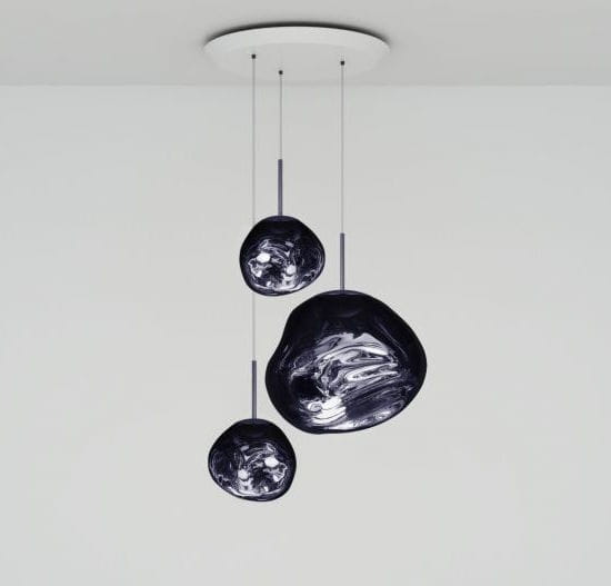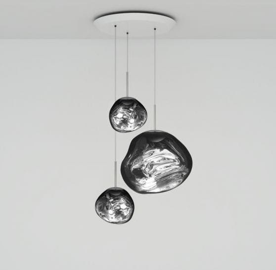Okrągły żyrandol zawierający jedną lampę wiszącą Melt i dwie lampy wiszące Melt Mini w nowoczesnym wykończeniu w czterech kolorach. Wyposażona w zintegrowany moduł LED, ta lampa sufitowa tworzy hipnotyzujący efekt topiącego się, dmuchanego na gorąco szkła, gdy jest włączona i efekt lustrzanego wykończenia, gdy jest wyłączona. Wykonana w Niemczech przy użyciu zaawansowanej technologii produkcji, aby osiągnąć perfekcyjny efekt stopionej kuli.